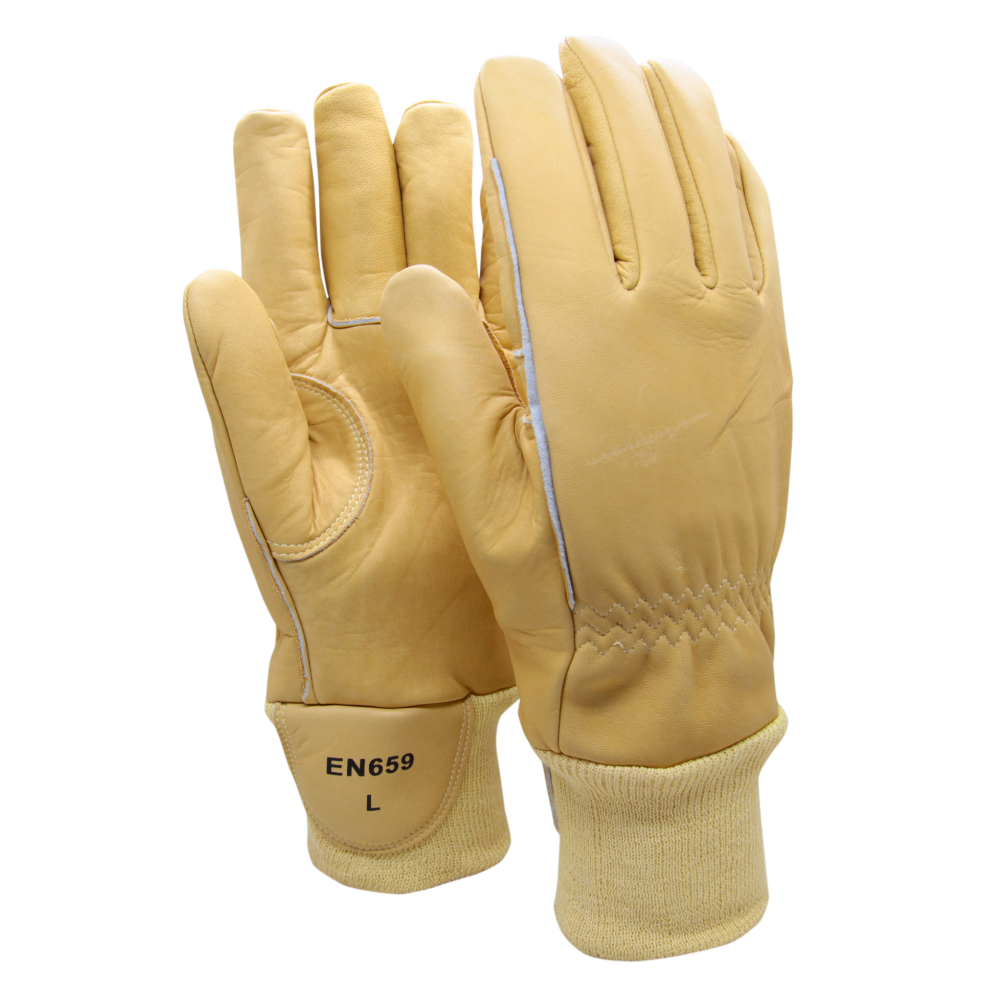 Värmetåliga skyddshandskar för brandmän, räddningstjänst och industri med krav på skydd mot eld och värme. Sydd i specialbehandlat, flamsäkert och tjock nötskinn i hela handsken. Extra förstärkningar i tumgreppet och besade sömmar för betydligt längre livslängd. Gjutet membran mellan nötskinn och foder som håller ute väta. Foder i värmeisolerande Kevlar. Trippla elastiska sömmar i handleden. Tätslutande mudd stickad i dubbla lager Kevlar med en kraftig förstärkningsflik på insidan för att enkelt kunna dra på och ta av handsken. Alla sömmar sydda i slittålig och värmetålig Kevlartråd.