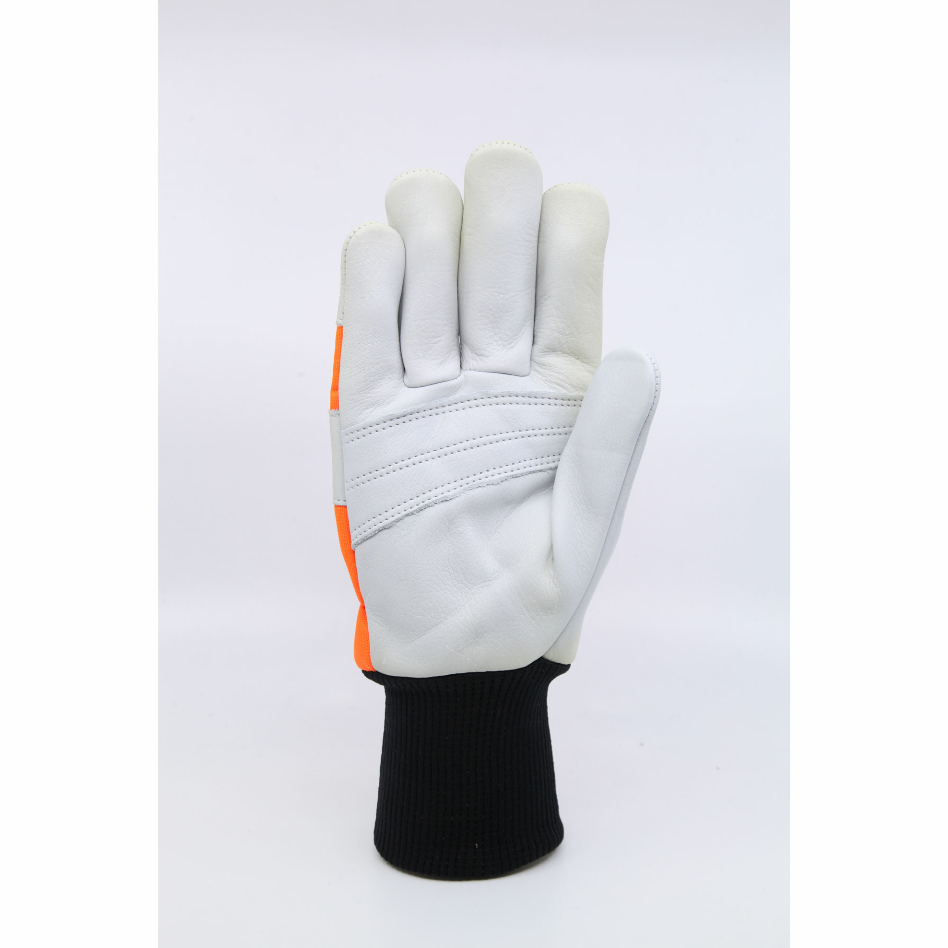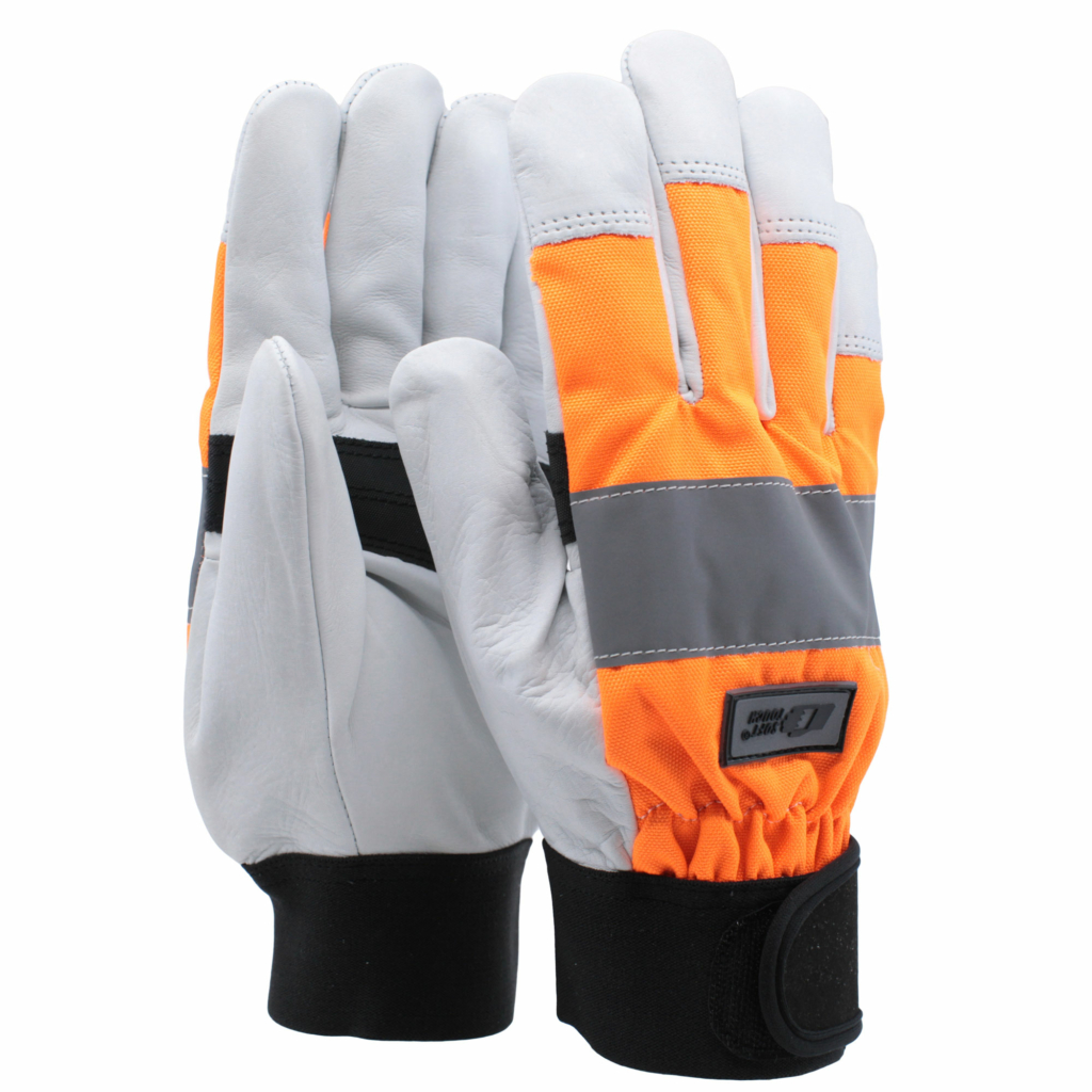 Slitstarka läderhandskar med högt sågskydd (20 m/s) på vänster ovanhand bestående av 18 lager ballistisk nylonfiber. Ovanhand i vattentät och slittålig polyamid. Det nötningståliga lädret är mjukt och följsamt, vilket ger en mycket bra motorsågskänsla. Kraftig greppförstärkning med dubbla lager nötskinn sytt med dubbla sömmar. Bred 3M® reflex över knogar för ökad synbarhet. Elastisk mudd med justerbar kardborreknäppning som sluter tätt och hindrar sågspån att komma in i handsken.