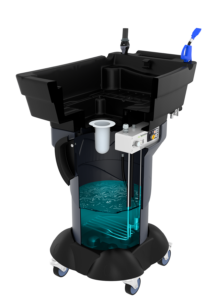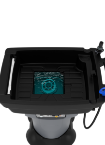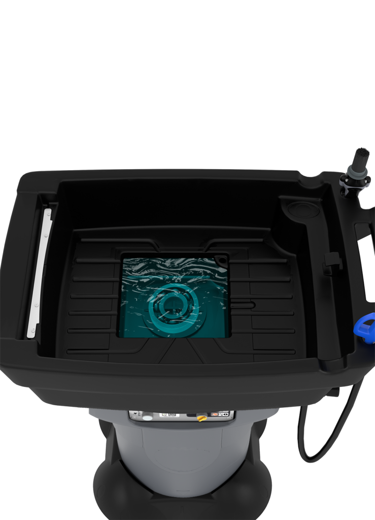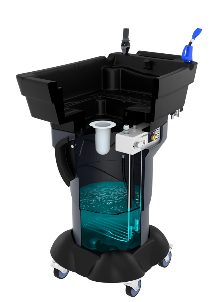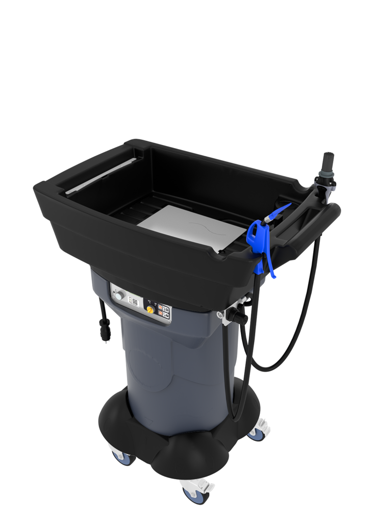 Gravity X3 är mobil med 4st svänghjul varav 2st med bromsar, och därför lämplig för olika typer av verkstäder och garage. Anslut till 230V och när indikatorlampan tänds, innebär det att rengöringsbadet har nått en optimal temperatur. Enheten är då oberoende och kan röra sig fritt inom verkstaden. Detta gör det enkelt att rengöra objekt på olika platser. Pumpen och blåspistolen för torkning fungerar på tryckluft.