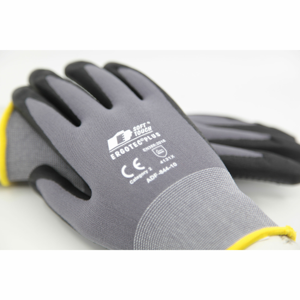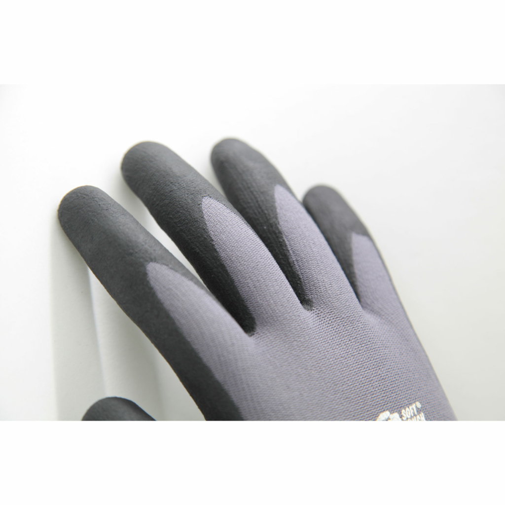 Sömlös stickad handske i nylon/lycra som är doppad i en PU- och nitrilblandning i innerhanden och över fingertopparna. Handsken är försedd med nitrildots i innerhanden för att ytterligare ge bra grepp. Handsken kan med fördel användas för alla typer av precisionsarbeten. Handsken är silikonfri, krom- och nickelfri, fri från lösningsmedel och lämnar inga fingeravtryck.